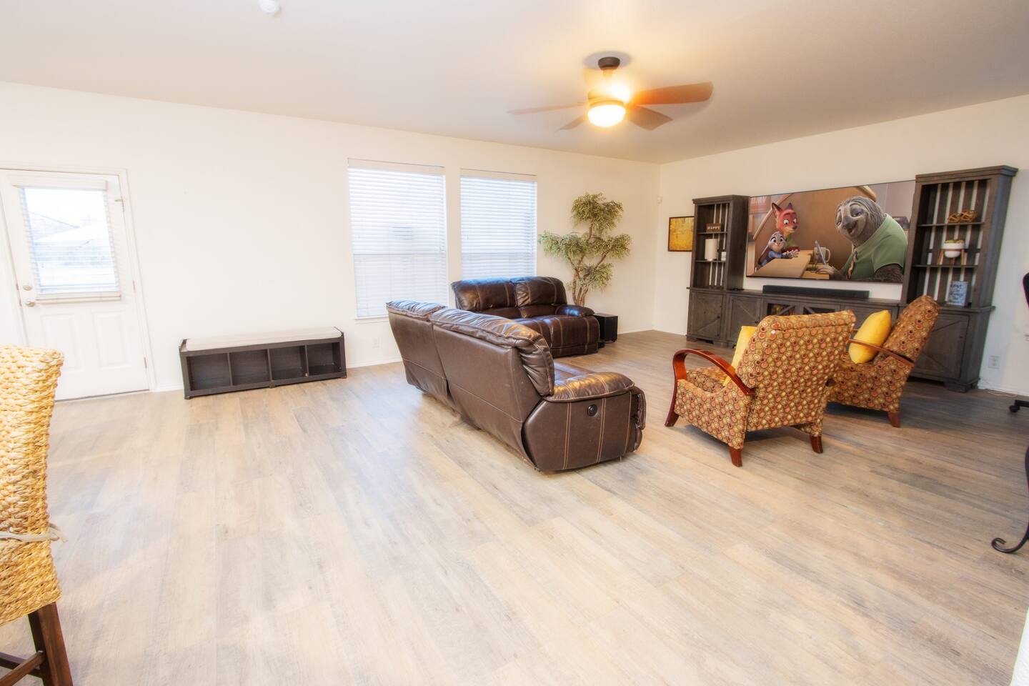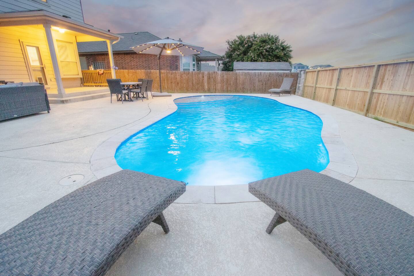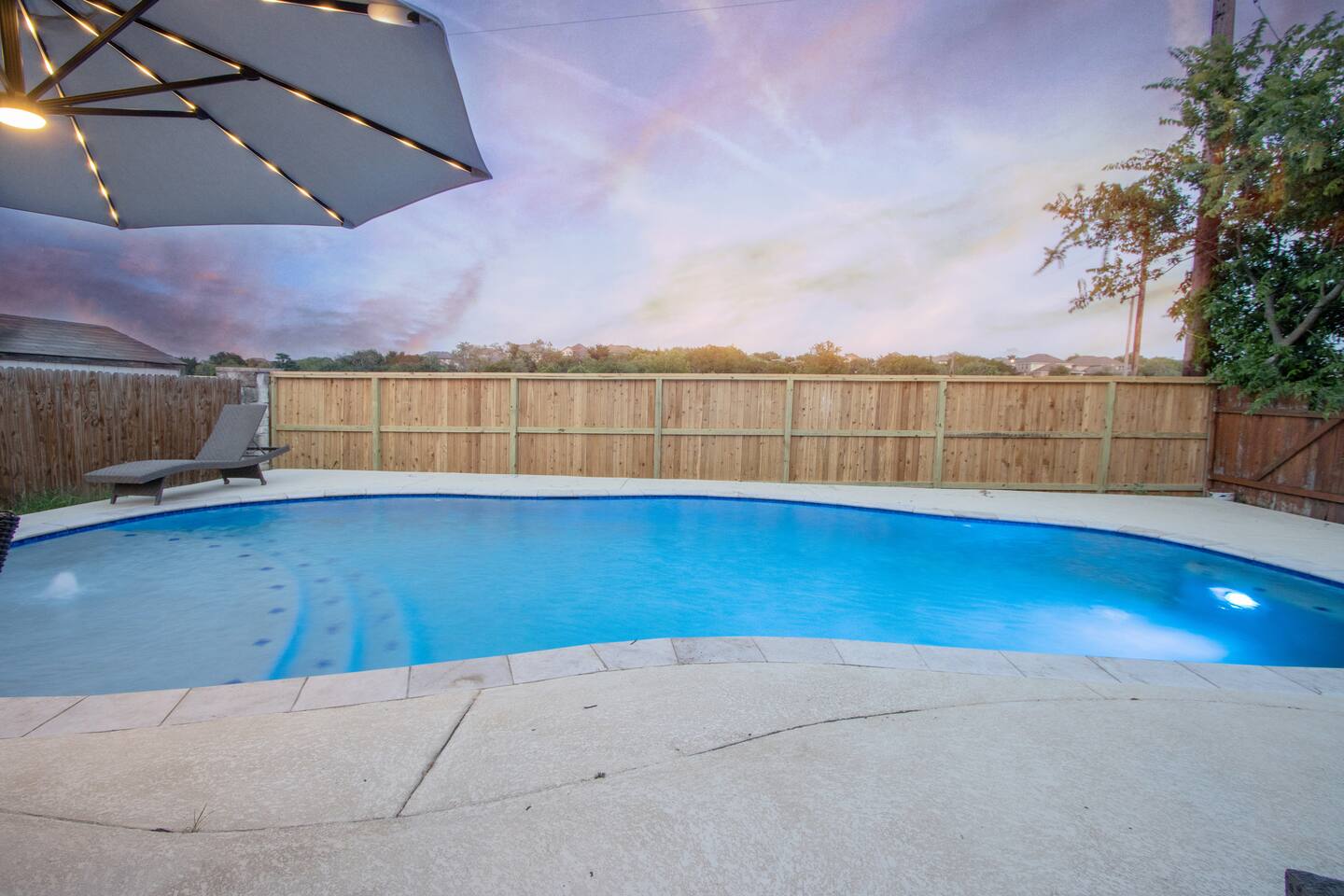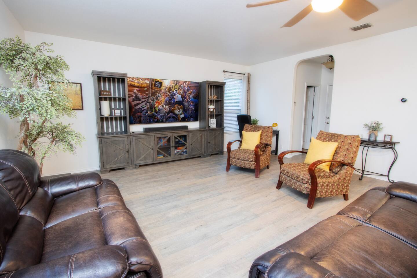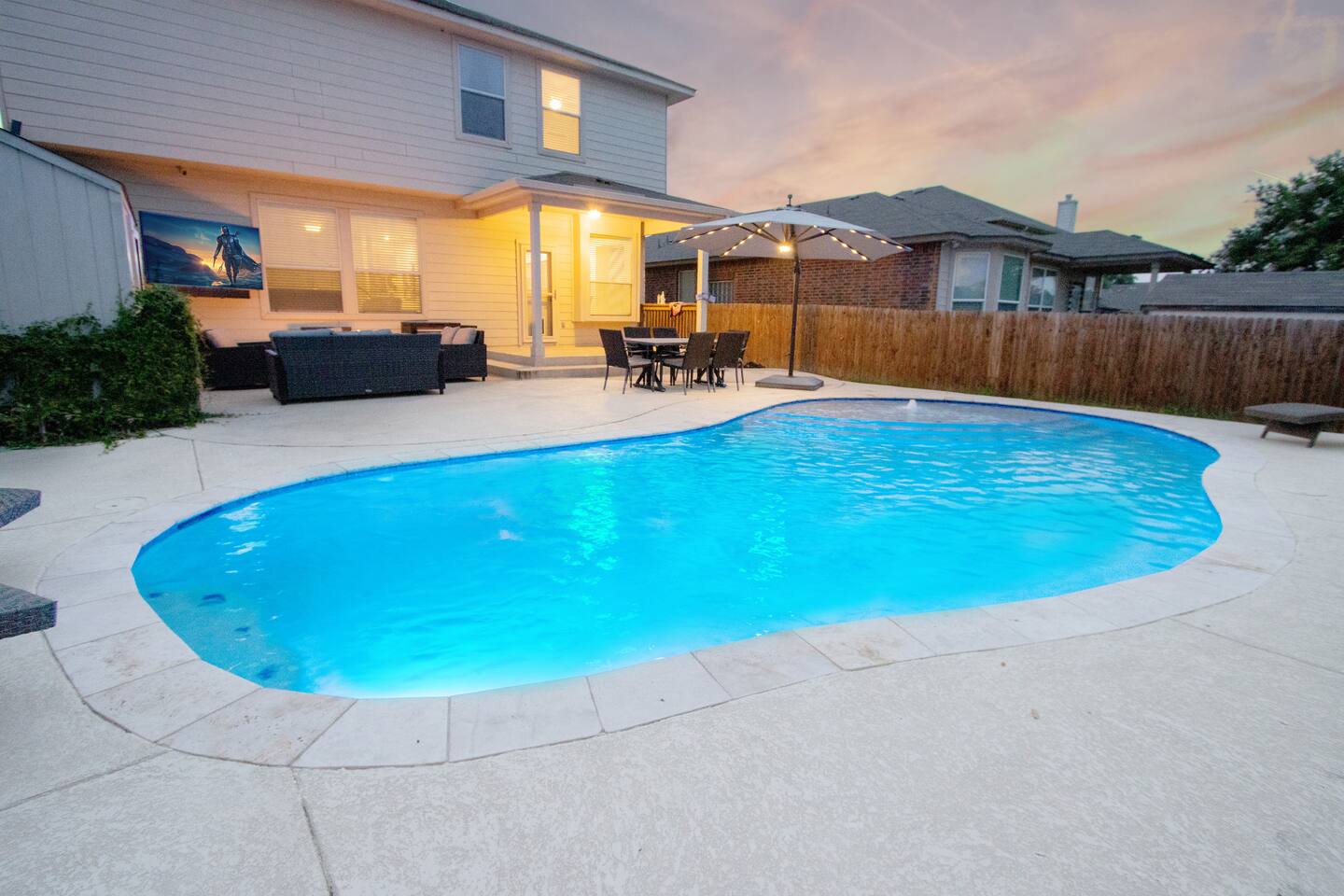 Our property is located in Alamo Ranch, a convenient upscale neighborhood in San Antonio, Texas. It has 4 bedrooms and can accommodate up to 12 guests. The Living room features an 85" 4k TV and reclining chairs. The backyard offers a private pool, outdoor TV, patio, and barbeque pit. Major attractions like The National Shooting Complex, Lackland AFB, Seaworld, and Fiesta Texas all nearby. ✔ Private Pool ✔ Outdoor Living ✔ BBQ