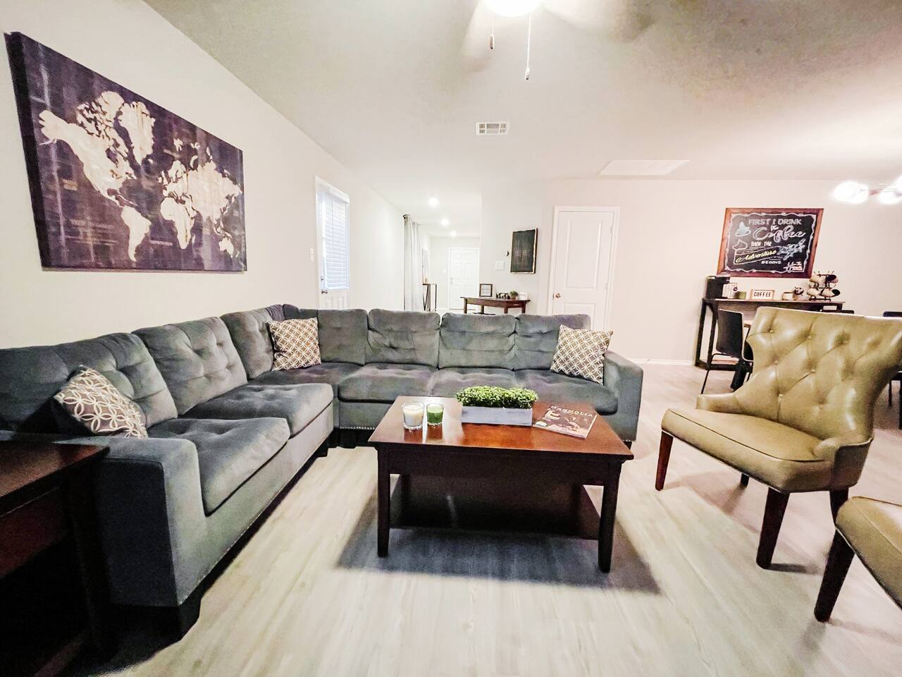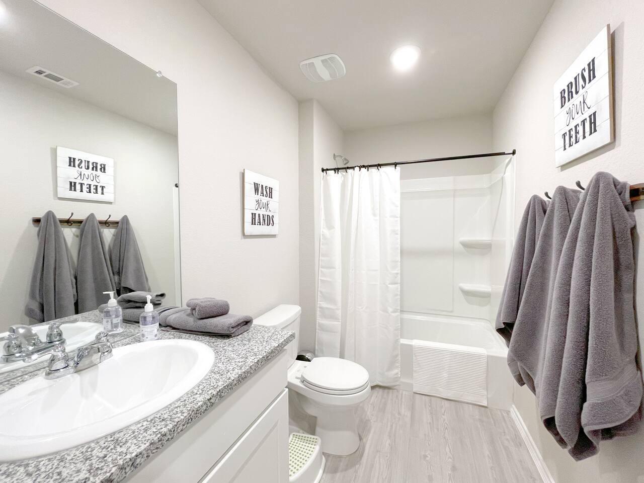 Let's start our tour in the spacious and contemporary open-design living area, which combines the entertaining living room, fully equipped kitchen, and inviting dining area. Move around the home to discover three highly comfortable bedrooms designed to offer the ultimate rest and relaxation after a day of experiencing the vibrant city of San Antonio! Sun shines through large windows over the entire space and, together with tastefully picked details and bright floors, creates a unique ambiance that will stay with you long after you leave. Cuddle up in front of the TV, or step onto the private backyard to prepare delicious BBQ and enjoy an al fresco meal worthy of the most praised restaurants. ★ LIVING ROOM ★ Spend a slow, relaxing afternoon sitting on a comfy sofa and watching your favorite movie with your friends and family. ✔ Snug L-Shaped Sofa with Pillows ✔ Smart TV with Netflix, Hulu, Disney Plus, At&T Now (HBO) ✔ Two Accent Chairs ✔ Coffee Tables It's not all rest, comfort, and relaxation in our lovely getaway. We didn't forget business travelers and have furnished a designated work desk to set up your laptop and stay in touch with the living room crowd. ✔ Workspace (Desk, Chair) ★ KITCHEN & DINING ★ The kitchen is decorated in bright tones and offers plenty of working areas with spacious granite countertops and stainless-steel cooking amenities. Grab some fresh ingredients from the local market and prepare delicious homemade meals for the whole group. ✔ Microwave ✔ Stove ✔ Oven ✔ Toaster ✔ Blender ✔ Double-Door Refrigerator/Freezer ✔ Dishwasher ✔ Sink - Hot & Cold Water ✔ Trays ✔ Glasses ✔ Silverware ✔ Pots & Pans The dining table is conveniently nestled between the living room and kitchen, allowing you to serve and enjoy those tasty meals without missing a moment of fun! The lovely coffee bar will also be the starting point of your daily adventures. ✔ Dining Table with Seating for 6 ✔ Fully Stocked Coffee Bar (Keurig Coffee Maker, Coffee Mugs) ★ SLEEPING ARRANGEMENTS - 3 BEDROOMS ★ These are the most relaxing areas of the home. Here you will find the comfort needed to rest and relax after a fabulous day exploring the city and its exciting attractions. Get those precious hours of sleep; tomorrow is a new day! ♛ Master Bedroom: King-Size Bed ♛ Bedroom 2: Queen-Size Bed ♛ Bedroom 3: Bunk Bed (Twin over Double) All bedrooms offer a similar set of amenities: ✔ Premium Pillows, Linens, and Sheets ✔ Smart TVs with Netflix, Hulu, Disney Plus, At&T Now (HBO) ✔ Closets with Hangers and Shelves ✔ Dressers with Spacious Drawers ✔ Night Stands with Reading Lamps ★ BATHROOMS ★ We have taken special care to design, furnish, and stock two full bathrooms and the half bath with all essentials, so you don't have to worry about packing or buying your own. ✔ Bathtub with a Shower ✔ Vanity ✔ Mirror ✔ Toilet ✔ Towels ✔ Hair Dryer ✔ Essential Toiletries ★ BACKYARD ★ If you want to enjoy the beautiful outdoors but don't feel like leaving home, the private, fully-fenced backyard accessible from the living room is a perfect place to do just that! Set the table while the BBQ is getting ready, and then sit down to enjoy some peace and quiet in San Antonio. It doesn't get much better than this. ✔ Dining Table with Seating for 6 ✔ BBQ Grill Bring your family and friends to this gorgeous home in the fantastic Los Jardines neighborhood. We know there's no place like home, but this gem will come at a close second. House rules. - We've put a lot of love in our place so please be respectful of it. - No pets allowed. A $300 per pet charge will be added for any undisclosed pets. - No smoking inside the home. A $300 charge will be added for smoking in the home. - No parties or events. Unapproved guests and/or parties/gatherings can result in immediate eviction. - An earlier checkin or late checkout may be possible depending on our other bookings and can only be confirmed 24 hours in advance. *Any unauthorized early check-ins or late check-outs will result in a fee of $10 per every 15 mins. - A $50 charge will be added for lost or stolen keys. - Please be mindful of the neighbors. Quiet time begins to 10 PM. *** Do not flush wipes or feminine products down the toilet. Toilet paperl i TRASH DAYS i (General Trash/Garbage) You will see a a brown trash bin. (Recycle) Blue trash bin for recyclables. (Organics) Green trash bin for organics. Wednesdays- Trash days for the brown bin (General Trash) Mondays- Blue recycle bin and Green Organics bin Feel free to take the out the bin the night before. As requested by the waste management service, they ask to please have the trash cans out on the curb those days no later than 6 am (Handle to the curb). If you are unsure which trash can to use then please dispose in the brown trash can. Disposing of trash in the wrong trash can will incur an additional fee of $75.
