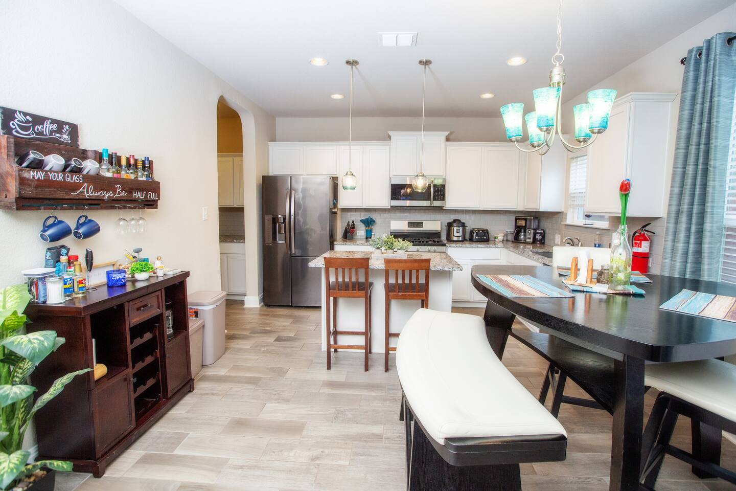 A blend of comfort, style, and convenience greets you as soon as you enter this elegant Nort Port oasis. While decorating this inviting retreat, we have worked hard to create a "2nd home" feeling for our guests. The open-concept design living area is the home's heartbeat, successfully combining the relaxing living room with an inviting dining area and a fully equipped kitchen. Large windows allow plenty of natural light to illuminate the space throughout the day, and together with the bright floors and tasteful décor, create a feeling of warmth and coziness. Another fun and cozy family space is situated on the upper floor, so explore the entire home before choosing where to spend your free time. Three comfortable bedrooms are designed to offer all the rest you need after an exciting day at the National Shooting Complex or exploring San Antonio and all its attractions and landmarks. If you don't feel like leaving the property but want to enjoy the outdoors, you don't have to go further than the enclosed backyard with a modern bbq and a comfortable lounge area. The home offers many amenities and spaces, and we can't wait for you to experience them all. ★ LIVING ROOMS ★ The living room is the heartbeat of our two-floor getaway, connecting to all other areas. See what the chef is up to, help them set the table, or unwind on the comfortable sofa while watching a movie or reading a good book. ✔ Oversized Sectional with Sofa with Pillows & Blankets ✔ Smart TV with Netflix ✔ Board Games ✔ LG Soundbar Bluetooth Sound System ✔ Stylish Reading Lamp ✔ Access to the Backyard Your children will love you for bringing them here when they see the upper-floor family space with many toys and entertaining amenities. ✔ Comfy Day Bed (can be converted into two Single Beds) ✔ Smart TV with Netflix ✔ Nintendo Wii Gaming Console ✔ Snug Sofa Chairs ✔ Toys ★ KITCHEN & DINING ★ Even the most demanding chefs would enjoy preparing delicious meals using numerous state-of-the-art cooking appliances. In addition, spacious countertops and the granite kitchen island provide plenty of workspaces to prepare delicious homemade delicacies. ✔ Microwave ✔ Stove ✔ Oven ✔ Toaster ✔ Blender ✔ Rice Maker ✔ Coffee Maker ✔ Refrigerator/Freezer ✔ Wine Cooler ✔ Dishwasher ✔ Sink - Hot & Cold Water ✔ Trays ✔ Glasses ✔ Silverware ✔ Pots & Pans Fix yourself a drink and see how the family chef is doing by sitting at the breakfast table and the kitchen bar. Once the gourmet lunch or dinner is ready, serve it on the formal dining table and savor a delicious feast. ✔ Dining Table with Seating for 8 ✔ Breakfast Table with Seating for 3 ✔ Kitchen Bar with Seating for 2 ✔ Drinks & Coffee Bar ★ SLEEPING ARRANGEMENTS - 3 BEDROOMS ★ Three tastefully furnished bedrooms are designed to provide hotel-like comfort and convenience needed to relax and rest so you can remain energized and do everything you have planned the next day. ♛ Master Bedroom: King-Size Bed, Ensuite Bathroom ♛ Bedroom 2: King-Size Bed ♛ Bedroom 3: Queen-Size Bed All bedrooms are equipped with a similar set of amenities. ✔ Premium Pillows, Linens, and Sheets ✔ Smart TVs with Netflix ✔ Closets with Hangers and Shelves ✔ Dressers with Spacious Drawers ✔ Night Stands with Reading Lights ★ BATHROOMS ★ The house features two full bathrooms on the upper floor and a convenient half bath accessible from the living area. All are stocked with clean towels and essential toiletries, so you don't have to worry about bringing your own. ✔ Soaker Tub and a Separate Walk-In Shower (Master Bath) ✔ Bathtub with a Shower ✔ Vanity (Double in the Master Bath) ✔ Mirror ✔ Toilet ✔ Towels ✔ Hair Dryer ✔ Essential Toiletries ★ BACKYARD ★ Escape the stresses of the outside world and step into this haven of tranquility, where the inviting lounge seating area and the sizzling BBQ grill promise countless hours of relaxation, entertainment, and cherished memories. ✔ BBQ Grill ✔ Lounge Seating Don't miss out on this incredible getaway—secure your stay today and embark on an unforgettable journey of relaxation and San Antonio adventures! Guest access The house is exclusively yours, without interruption during your stay, so relax, unwind, and make yourself at home. Other than the already mentioned amenities, our home also features the following: ✔ High-Speed Wi-Fi ✔ Air Conditioning ✔ Heating ✔ Laundry Room (Washer/Dryer, Iron/Board, Detergent, Dryer Sheets) ✔ Free Parking House rules. - We've put a lot of love in our place so please be respectful of it. - No pets allowed. A $300 per pet charge will be added for any undisclosed pets. - No smoking inside the home. A $300 charge will be added for smoking in the home. - No parties or events. Unapproved guests and/or parties/gatherings can result in immediate eviction. - An earlier checkin or late checkout may be possible depending on our other bookings and can only be confirmed 24 hours in advance. *Any unauthorized early check-ins or late check-outs will result in a fee of $10 per every 15 mins. - A $50 charge will be added for lost or stolen keys. - Please be mindful of the neighbors. Quiet time begins to 10 PM. *** Do not flush wipes or feminine products down the toilet. Toilet paper i TRASH DAYS i (General Trash/Garbage) You will see a a brown trash bin. (Recycle) Blue trash bin for recyclables. (Organics) Green trash bin for organics. Wednesdays- Trash days for the brown bin (General Trash) Mondays- Blue recycle bin and Green Organics bin Feel free to take the out the bin the night before. As requested by the waste management service, they ask to please have the trash cans out on the curb those days no later than 6 am (Handle to the curb). If you are unsure which trash can to use then please dispose in the brown trash can. Disposing of trash in the wrong trash can will incur an additional fee of $75.