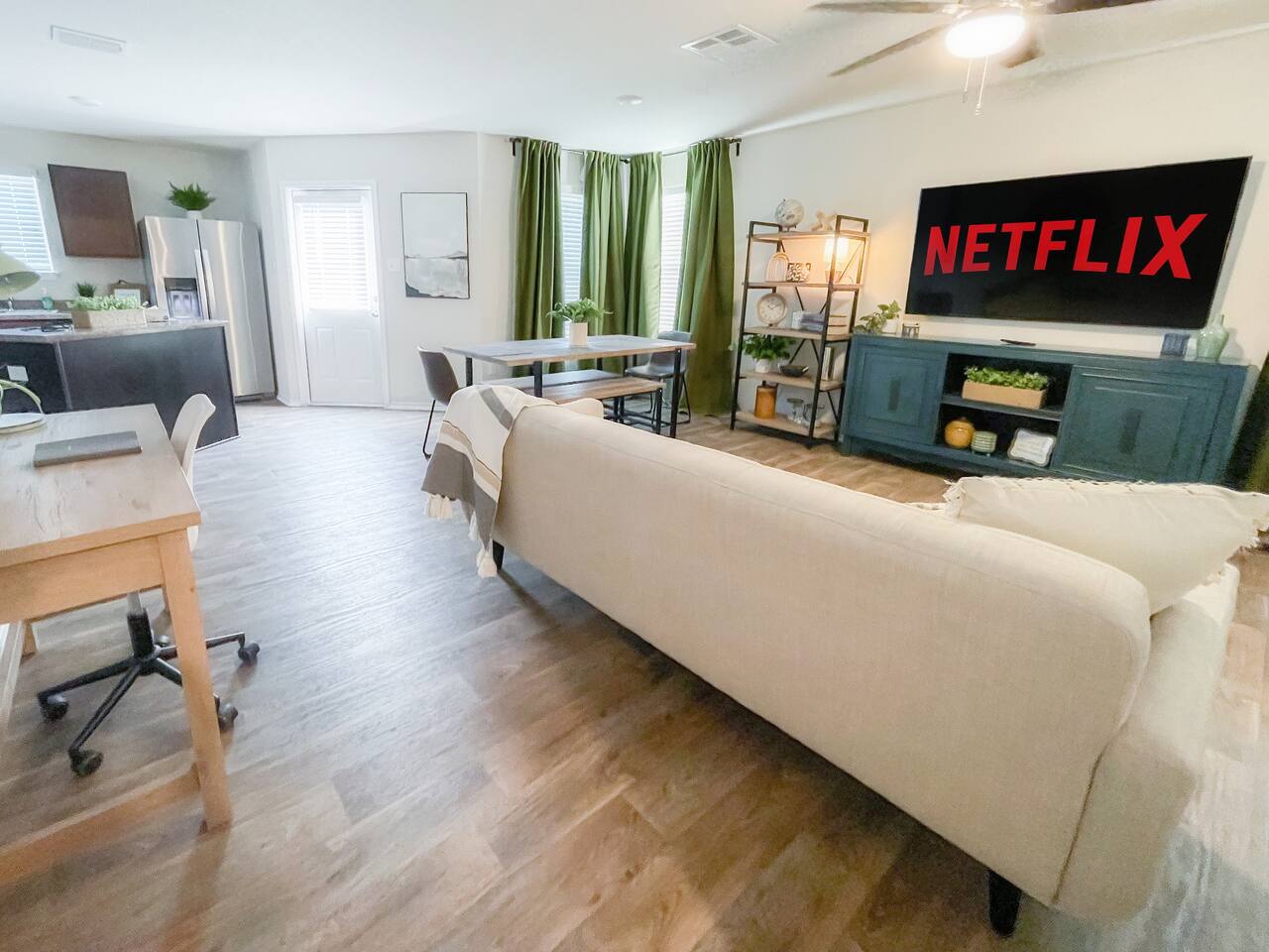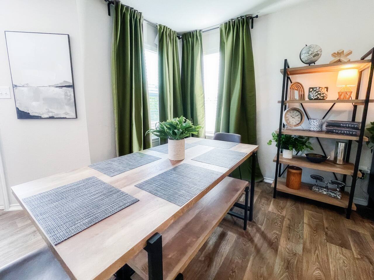 Please take a tour through this spacious oasis to familiarize yourself with all the comforts and amenities it offers. The best place to start is the majestic open-concept design living area. The home's heartbeat features an entertaining living room with a fully equipped kitchen and an inviting dining area. Natural sunlight accents the tastefully picked furniture to reinforce the colorful style you'll get to enjoy with your family and friends. You can quickly change your settings by stepping into the backyard, offering a private haven with a large lawn, perfect for outdoor relaxation and activities. Contemporary design and comforts are present in three bedrooms that will have you sleeping like royalty. ★ LIVING ROOM ★ The home's focal point is ideal for a fun family gathering. Sit back, relax, and decide if you will watch a movie, read a good book, or discuss your plans for days to come. ✔ Comfortable Sofa with Pillows & Throw Blankets ✔ Smart TV with Netflix and Hulu ✔ Chic Sofa Chairs ✔ Coffee Tables ✔ Reading Lamps ✔ Access to the Backyard The need to work from home has never been greater, so we furnished a designated workspace where you can set up your laptop and attend to work. ✔ Workspace (Desk, Chair, Lamp) ★ KITCHEN & DINING ★ The fully equipped kitchen comprises of ample cabinetry, spacious granite countertops, and state-of-the-art appliances that allow for the effortless and fun preparation of your favorite meals. ✔ Microwave ✔ Stove ✔ Oven ✔ Toaster ✔ Blender ✔ Keurig Coffee Maker (Complimentary K-Pods) ✔ Hot Water Kettle ✔ Refrigerator/Freezer ✔ Dishwasher ✔ Sink - Hot & Cold Water ✔ Plates ✔ Glasses ✔ Silverware ✔ Pots & Pans Gather 'round the lovely dining table and enjoy a tasty homemade meal. ✔ Dining Table with Seating for 6 ★ SLEEPING ARRANGEMENTS – 3 BEDROOMS★ Three comfortable bedrooms make you feel like sleeping on clouds while providing maximum convenience through added amenities. ♛ Master Bedroom: King-Size Bed, Ensuite Bathroom ♛ Bedroom 2: Queen-Size Bed ♛ Bedroom 3: Two Single Beds + Two Single Trundles All bedrooms offer a similar set of amenities: ✔ Premium Pillows, Linens, and Sheets ✔ Smart TVs ✔ Closets with Hangers and Shelves ✔ Dressers with Spacious Drawers ✔ Night Stands with Reading Lamps ★ BATHROOMS ★ The master bedroom features its ensuite bathroom, while the second full bathroom caters to the remaining bedrooms and the living area. Both are stocked with essential toiletries, so you don't need to worry about overpacking. ✔ Bathtub with a Shower ✔ Walk-In Shower ✔ Vanity (Double in Master Bath) ✔ Mirror ✔ Toilet ✔ Towels ✔ Hair Dryers ✔ Essential Toiletries ★ BACKYARD ★ Whether you're seeking a peaceful swim or an alfresco dining experience, our backyard promises relaxation and entertainment. It's the perfect place to unwind and create lasting memories during your San Antonio stay. ✔ Luxury Swimming Pool ✔ Dining Table with Seating for 6 ✔ Sun Lounges ✔ Charcoal BBQ Grill Spend a memorable vacation in this brand-new home where modern amenities and stylish décor mix with the highest comforts. House rules. - We've put a lot of love in our place so please be respectful of it. - No pets allowed. A $300 per pet charge will be added for any undisclosed pets. - No smoking inside the home. A $300 charge will be added for smoking in the home. - No parties or events. Unapproved guests and/or parties/gatherings can result in immediate eviction. - An earlier checkin or late checkout may be possible depending on our other bookings and can only be confirmed 24 hours in advance. *Any unauthorized early check-ins or late check-outs will result in a fee of $10 per every 15 mins. - A $50 charge will be added for lost or stolen keys. - Please be mindful of the neighbors. Quiet time begins to 10 PM. *** Do not flush wipes or feminine products down the toilet. Toilet paper