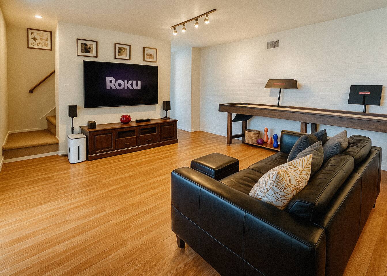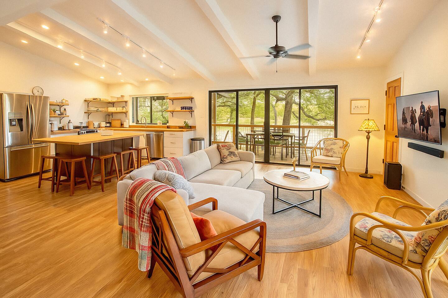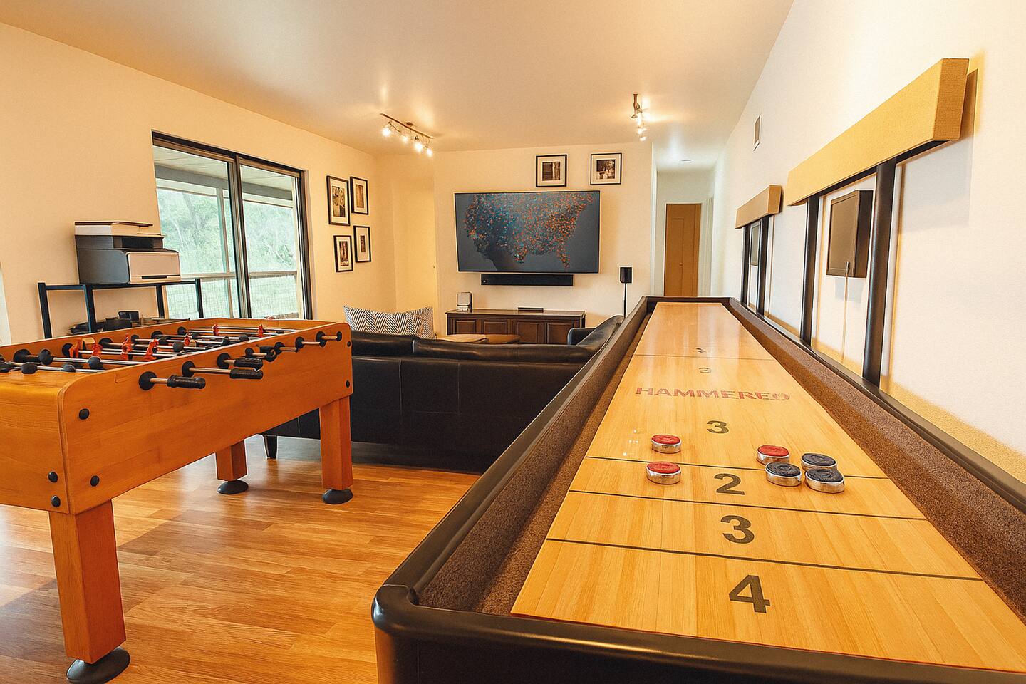 This cozy two-story house, situated on the edge of Lake Dunlap, offers an open concept living area with plenty of windows for natural lighting and scenic views, and beautiful hardwood floors throughout. Unwind with your loved ones while watching a movie or gather in the fully equipped eat-in kitchen for a delicious meal. After dinner, family game night is a must in the game room that boasts a foosball table, shuffleboard table, and a smart TV where you can watch the game while you play or turn on cartoons for the little ones. With plenty of fun things to do in the New Braunfels area, you will be delighted to return home after the day’s adventures and recharge in one of the 3 bedrooms, decorated in comfort and style so that you’ll be well rested for what the next day brings. But you don’t even have to leave this lakeside sanctuary to enjoy the fresh outdoors and soak up some Texas sun! The beautiful backyard is any traveler’s dream, complete with an outdoor deck as wide as the home, ample seating and dining space, and a paved walkway to the lake where you will find a private dock, more seating and lounging space, a BBQ grill, and fire pit for smores after sunset. If you desire a peaceful sanctuary to get away, or a place to lay your head after exploring the area, you will find it all here in Lake Dunlap. ★ LIVING ROOM ★ Indulge yourself in the comfort of the living room, where you can relax with your favorite show on the smart TV, kick back and enjoy the view from the oversized windows or create lasting memories with your loved ones in this inviting space. ✔ Large sofa ✔ Two cushioned chairs ✔ Smart TV with soundbar ✔ Stylish reading lamp ✔ Cocktail table ✔ Area rug ★ KITCHEN & DINING ★ The fully equipped kitchen features eat-in dining with seating for 5 at the butcher block counter. Sharing in the same open space is a traditional dining area with additional seating, fireplace, and large widows that face the beautiful surroundings of this property. With a contemporary design and modern amenities, you’ll enjoy creating delicious meals in this space with plenty of room for helping hands or socializing while you cook. ✔ Refrigerator with French doors and ice maker/water dispenser ✔ Electric stove with smooth cooktop ✔ Microwave ✔ Dishwasher ✔ Coffee maker ✔ Toaster ✔ Pots and pans ✔ Dishes and silverware ★ SLEEPING ARRANGEMENTS – 3 BEDROOMS ★ After a fun-filled day by the water, retreat to the three bedrooms where you will find all the comforts needed to unwind and get a good night sleep. All three bedrooms are on the main level of the home. ✔ Bedroom 1: Queen bed with Smart TV ✔ Bedroom 2: Queen bed, Single bed, private access to outdoor deck with seating ✔ Bedroom 3: King bed with Smart TV All bedrooms are equipped with a similar set of amenities ✔ Premium pillows, linens, and sheets ✔ Closets with hangers and shelves ✔ Dressers ✔ Nightstands with reading lamps ★ BATHROOMS ★ The home features two full baths with easy access from all bedrooms. To ensure that you have a comfortable and carefree stay, we have provided essential toiletries and fresh towels in each bathroom. ✔ Bathroom 1: Bathtub with shower, large vanity with mirror, window with blinds for privacy ✔ Bathroom 2: Walk-in shower, large vanity with mirror ✔ Hair dryer available ★ GAMEROOM ★ Located on the lower level of the home is a well-appointed game room designed for your entertainment. Turn up the lights for an exciting game of foosball and shuffleboard or turn them down while you snuggle on the couch and watch a movie on the Smart TV. The sliding glass door provides plenty of natural light as well as access to the backyard. ★ BACKYARD ★ This is where the magic happens! The large backyard offers plenty of room for play or relaxation with fencing on both sides. Underneath the upper deck is a covered outdoor seating area facing Lake Dunlap. Stroll down the paved walkway to the waters edge where you will enjoy a covered pavilion with a charcoal grill and outdoor dining accommodations. There are several lounge chairs for some Vitamin D therapy, and a private dock with even more tables and chairs for waterfront dining. If you have any questions about this lakeside retreat, please do not hesitate to ask. We are happy to assist in any way we can. House rules. - We've put a lot of love in our place so please be respectful of it. - No pets allowed. A $300 per pet charge will be added for any undisclosed pets. - No smoking inside the home. A $300 charge will be added for smoking in the home. - No parties or events. Unapproved guests and/or parties/gatherings can result in immediate eviction. - An earlier checkin or late checkout may be possible depending on our other bookings and can only be confirmed 24 hours in advance. *Any unauthorized early check-ins or late check-outs will result in a fee of $10 per every 15 mins. - A $50 charge will be added for lost or stolen keys. - Please be mindful of the neighbors. Quiet time begins to 10 PM. *** Do not flush wipes or feminine products down the toilet. Toilet paper i TRASH DAYS i (General Trash/Garbage) You will see a a brown trash bin. (Recycle) Blue trash bin for recyclables. (Organics) Green trash bin for organics. Wednesdays- Trash days for the brown bin (General Trash) Mondays- Blue recycle bin and Green Organics bin Feel free to take the out the bin the night before. As requested by the waste management service, they ask to please have the trash cans out on the curb those days no later than 6 am (Handle to the curb). If you are unsure which trash can to use then please dispose in the brown trash can. Disposing of trash in the wrong trash can will incur an additional fee of $75.